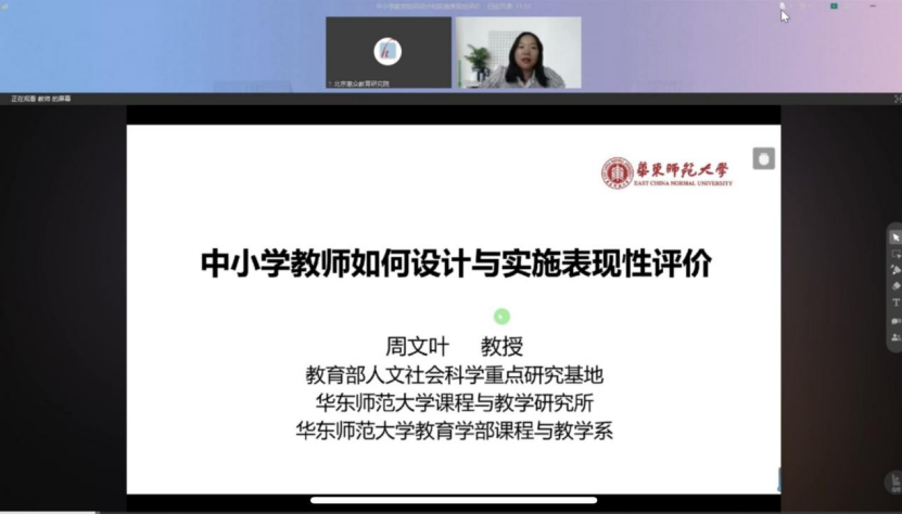 9月25日,教育部人文社会科学重点研究基地华东师范大学课程与教学研究所周文叶教授做客惠众讲堂2025年第4期,讲座主题为“中小学教师如何设计和实施表现性评价”。