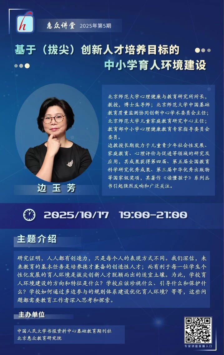 惠众讲堂—2025年10月17日19:00-21:00基于(拔尖)创新人才培养目标的中小学育人环境建设